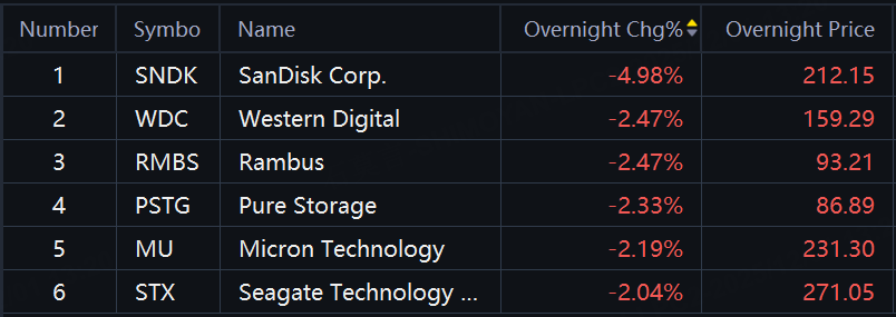 Storage shares fell in overnight trading. SanDisk down 5%; Western Digital, Rambus, Pure Storage, Micron, Seagate down over 2%.