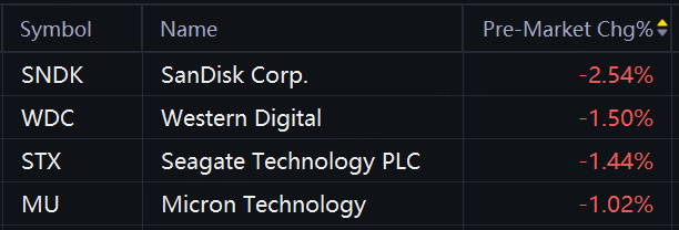 Memory-chip stocks dropped in premarket trading. SanDisk fell 3%; Western Digital fell 2%; Seagate and Micron Technology fell 1%.