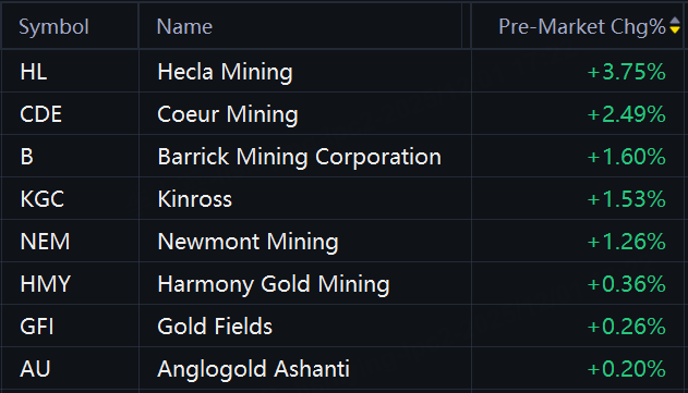 Gold and silver stocks rose in premarket trading as Silver jumped more than 2% to a record high. Hecla Mining rose 4%; Coeur Mining rose 3%; Barrick Mining and Kinross rose 2%. First Majestic Silver rose 3%; Endeavour Silver, Pan American Silver, and Fortuna Silver Mines rose 2%.