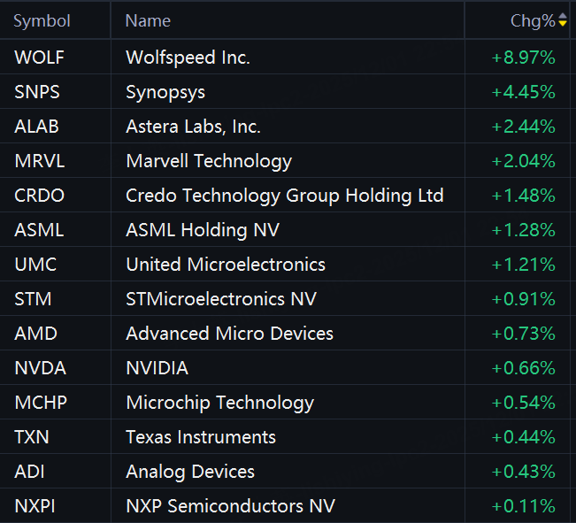 Some chip stocks rose in morning trading. Nvidia shares turned positive; Wolfspeed rose 9%; Synopsys rose 5%; Astera Labs, Marvell Technology, and Credo Technology rose 2%; ASML rose 1%.