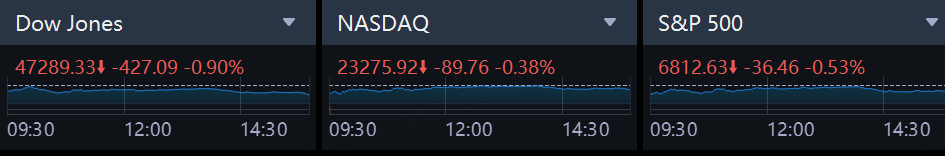 The Dow Jones Industrial Average .DJI fell 427.09 points, or 0.90%, to 47,289.33, the S&P 500 .SPX lost 36.46 points, or 0.53%, to 6,812.63 and the Nasdaq Composite .IXIC lost 89.76 points, or 0.38%, to 23,275.92.