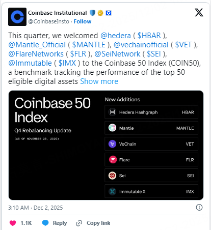Coinbase Institutional has updated its Coinbase 50 Index (COIN50) for the fourth-quarter rebalancing, adding Hedera (HBAR), Mantle (MANTLE), VeChain (VET), Flare (FLR), Sei (SEI), and Immutable (IMX). The reshuffle also sees six tokens, SKL, AKT, LPT, SNX, HNT, and CVX, removed from the index as part of the regular quarterly adjustments.