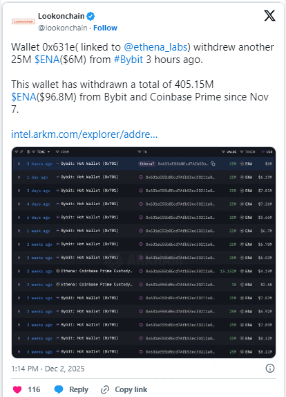A wallet identified as 0x631e, linked to Ethena Labs, withdrew another 25 million ENA (around $6 million) from Bybit roughly three hours ago. The address has now accumulated a total of 405.15 million ENA, worth approximately $96.8 million, in withdrawals from Bybit and Coinbase Prime since November 7, marking a sustained pattern of large-scale accumulation.