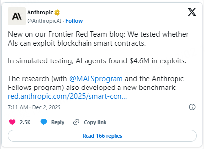 Anthropic’s latest research reveals that advanced AI agents now demonstrate significant real-world exploit capabilities on blockchain systems. In simulations of historical smart-contract hacks from 2020–2025, models including Claude Opus 4.5, Sonnet 4.5, and GPT-5 collectively recreated about $4.6 million worth of exploits. After scanning 2,849 newly deployed contracts with no previously known vulnerabilities, the systems also uncovered two new zero-day bugs and generated profitable attacks. The findings suggest AI-driven exploit revenues are doubling every 1.3 months, signaling that autonomous, profit-seeking smart-contract exploitation is becoming technically feasible.