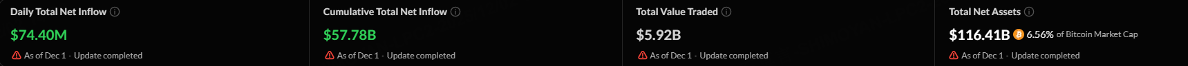 The overall net inflow of the US Bitcoin spot ETF on Monday was $74.4 million. The total net asset value of Bitcoin spot ETFs is $116.41 billion, and the ETF net asset ratio (market value compared to total Bitcoin market value) is 6.56%.