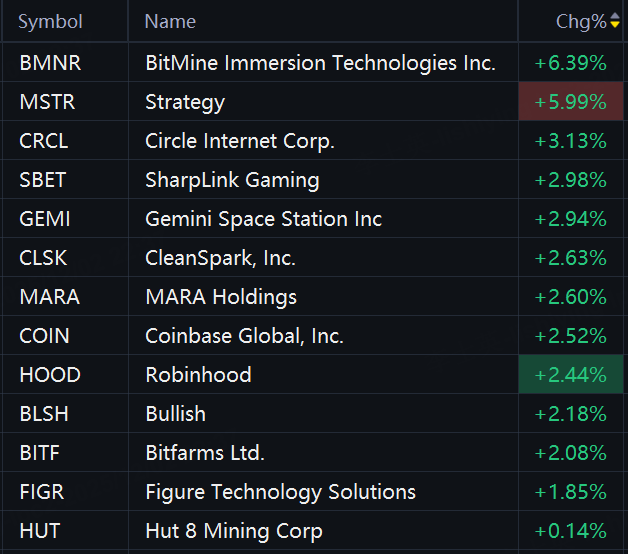 Crypto stocks rallied in morning trading as bitcoin rebounded above $8,8000. BitMine and Strategy rose 6%; Circle, SharpLink Gaming, Gemini, CleanSpark, MARA Holdings, and Coinbase rose 3%; Robinhood, Bullish, and Bitfarms rose 2%.