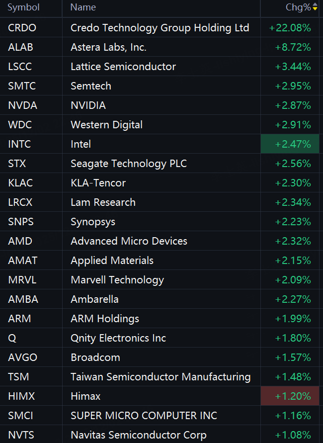 Semiconductor stocks jumped in morning trading. Credo Technology rose 22%; Astera Labs rose 9%; Nvidia, Western Digital, Seagate, and Intel rose 3%; AMD and Marvell rose 3%; Arm, Broadcom, and TSMC rose 2%.