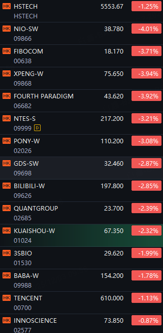 HSTECH fell 1.2%; Nio, Xpeng and Fourth Paradigm down 4%; Fibocom, Netease, Bilibili and Pony down 3%. Alibaba down 2%.