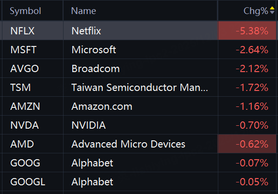 Big tech stocks dropped in morning trading. Netflix fell 5%; Microsoft fell 3%; Broadcom and TSMC fell 2%; Amazon fell 1%; Nvidia fell 0.7%.
