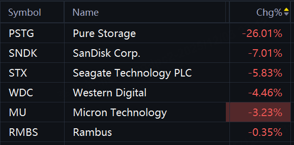Memory-chip stocks sank as Pure Storage’s earnings results failed to impress. Pure Storage fell 26%; SanDisk fell 7%; Seagate Technology fell 6%; Western Digital fell 5%; Micron Technology fell 3%.