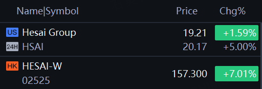 Hesai stock jumped 5% in overnight trading while gained 7% in Hong Kong market on Friday.