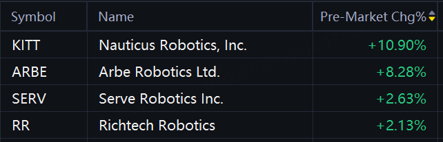 Nauticus Robotics rose 11%; Arbe Robotics rose 8%; Richtech Robotics rose 3%; Serve Robotics rose 2%.