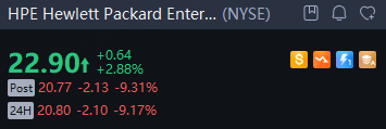 Shares of HPE, which provides AI-optimized servers that run on high-end Nvidia processors, fell 9% in overnight trading.