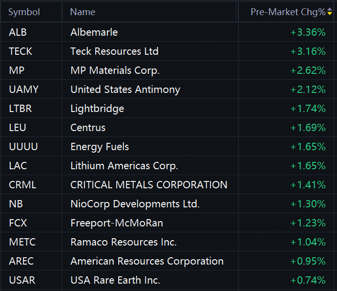 Critical minerals companies shares gained again as US planned more stakes in minerals companies. Albemarle, Teck Resources, and MP Materials rose 3%; United States Antimony, Lightbridge, Centrus, Energy Fuels, and Lithium Americas rose 2%.