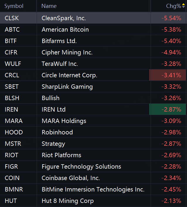 Crypto stocks dropped in morning trading as bitcoin fell below $90,000. CleanSpark, Bitfarms, American Bitcoin, and Cipher Mining fell 5%; Circle, SharpLink Gaming, TeraWulf, Bullish, MARA Holdings, Robinhood, Strategy, and IREN fell 3%; Coinbase and BitMine fell 2%.