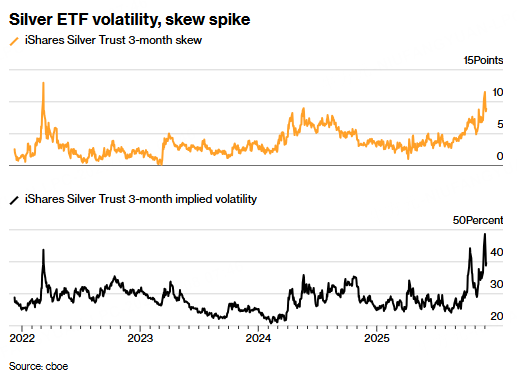 Implied options volatility in the iShares Silver Trust, the biggest ETF tracking the metal, rose last week to the highest since early 2021, when for a brief period silver attracted meme-stock traders. Almost $1 billion flowed into the ETF over the past week, exceeding the influx into the largest gold fund and adding further support to spot prices.