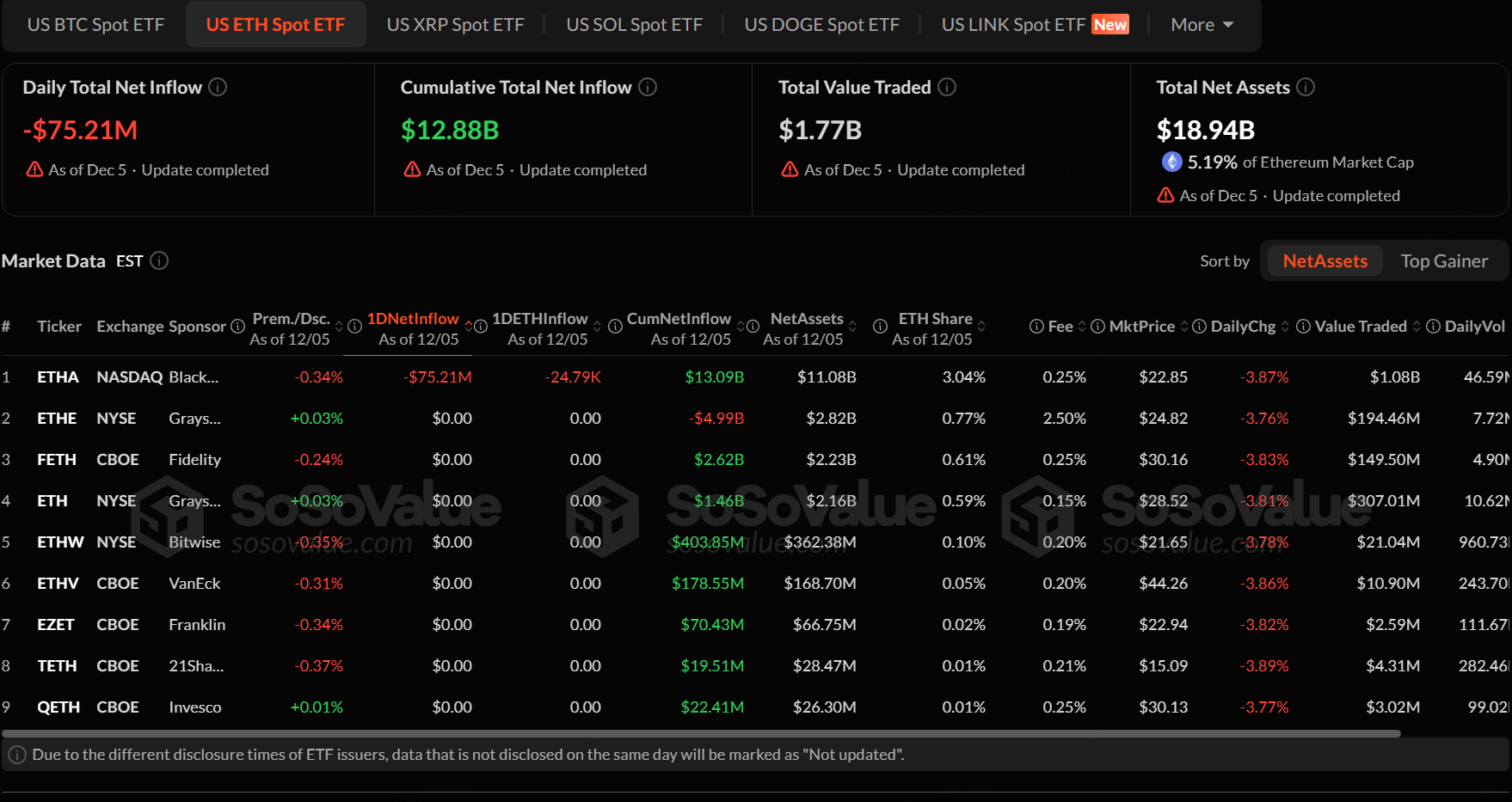The Ethereum spot ETF with the highest net outflow on December 5 was iShares Ethereum Trust ETF (ETHA), with a net outflow of $75.21 million, according to SoSoValue.