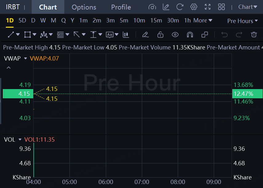 Shares of iRobot rose over 12% in premarket trading following a report that the Trump administration is working on accelerating development of the robotics sector.