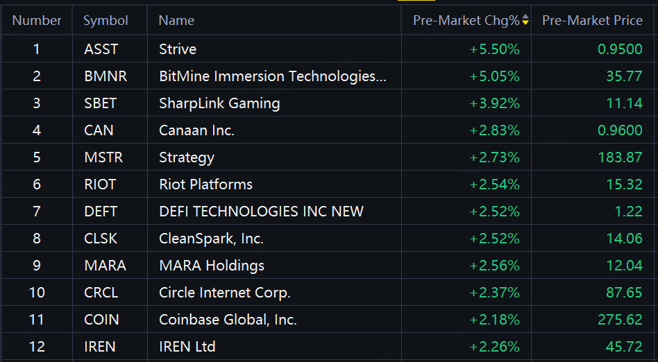 Crypto shares jumped in premarket trading. Strive, BitMine up over 5%; SharpLink Gaming up 4%; Canaan, Strategy, Riot Platforms DeFi Tech, MARA Holdings, Circle, Coinbase up over 2%.
