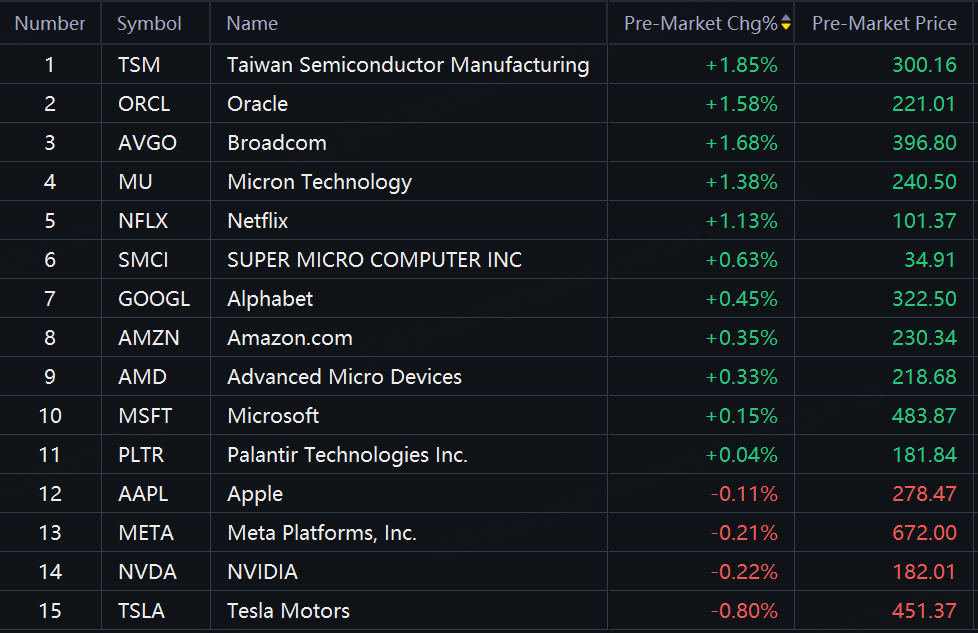 Big tech stocks mostly rose in premarket trading. TSMC, Oracle, Broadcom, Micron, Netflix shares rose over 1%.