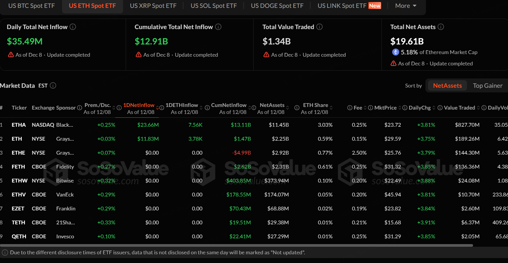 The Ethereum spot ETF with the highest net inflow on December 8 was was iShares Ethereum Trust ETF (ETHA), with a net inflow of 23.66 million, according to SoSoValue.