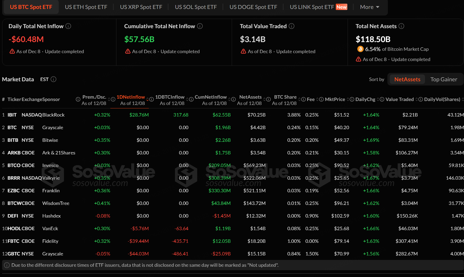 The Bitcoin spot ETF with the highest net inflow on December 8 was iShares Bitcoin Trust (IBIT), with a net inflow of $28.76 million, according to SoSoValue.