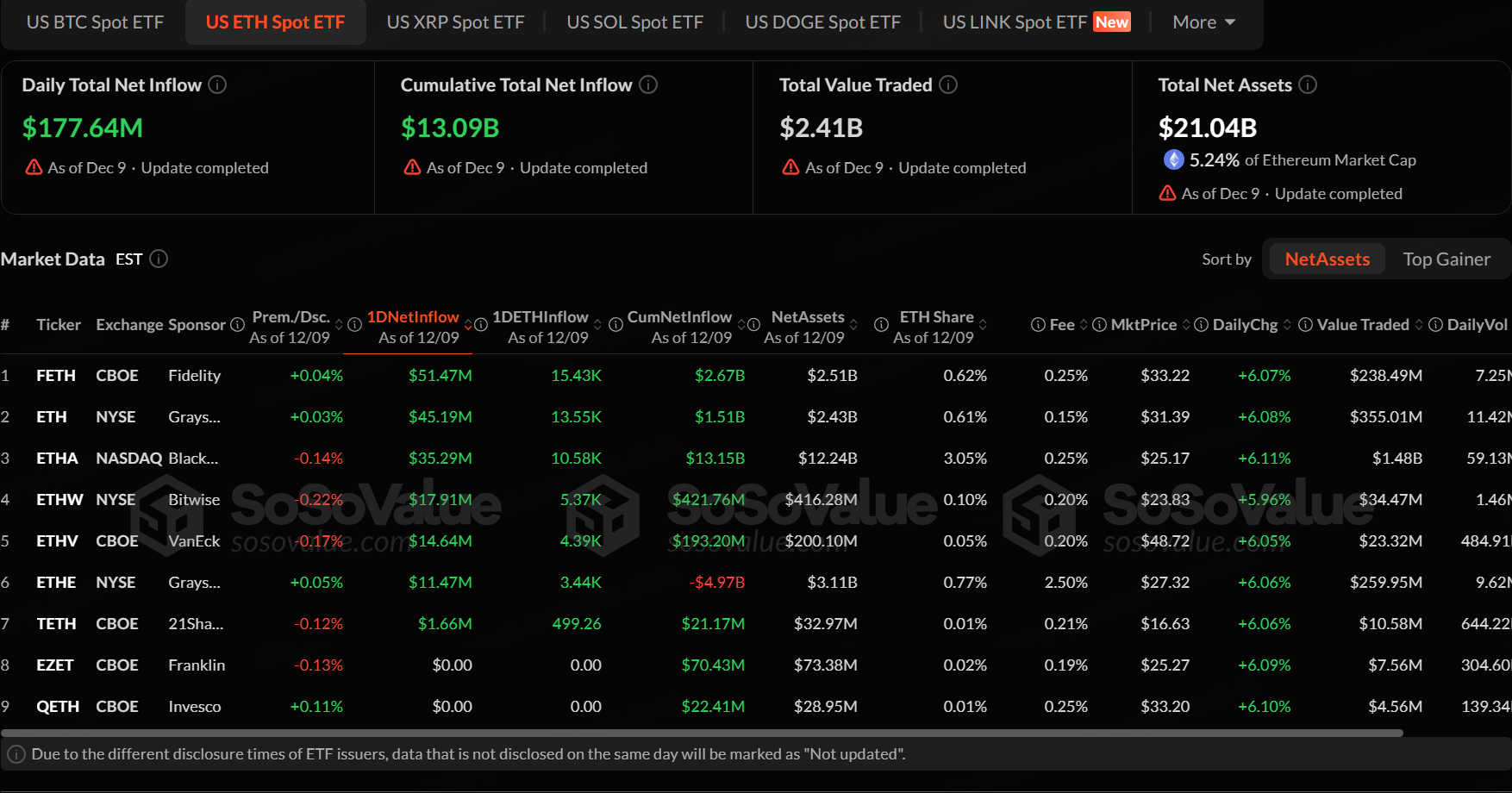 The Ethereum spot ETF with the highest net inflow on December 9 was Fidelity Ethereum Fund (FETH), with a net inflow of $51.47 million, according to SoSoValue.