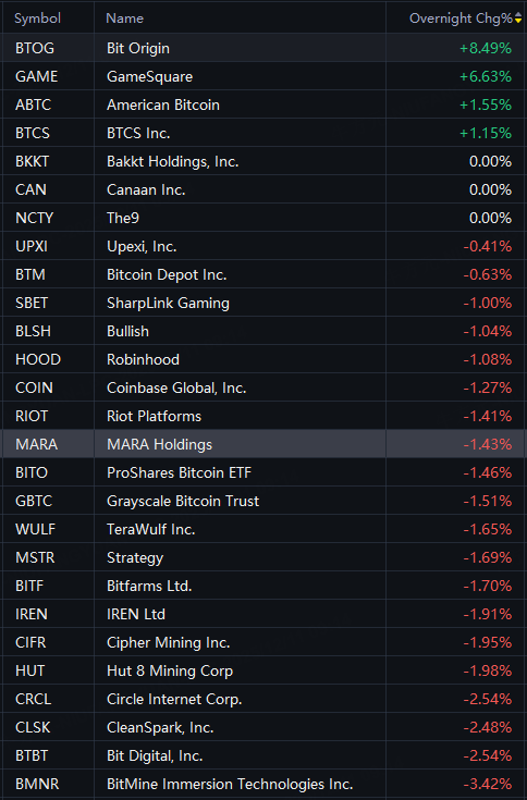 Bit Origin up 8%; GAME up 7%; BMNR, Circle fell 3%; CleanSpark, Strategy, Iren fell 2%; Coinbase, Bullish, SBET fell 1%.