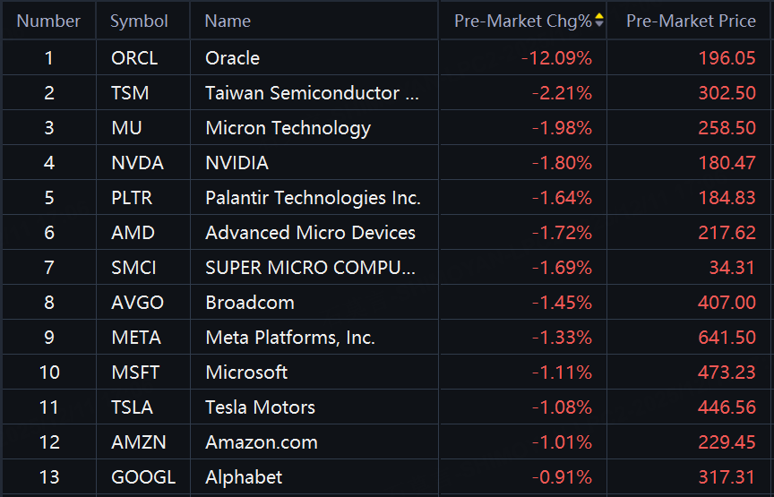 Big tech stocks fell in premarket trading as Oracle's results reignited fears about high-flying tech stocks even after the Federal Reserve's latest interest rate cut gave a boost to U.S. equity markets in the prior session.