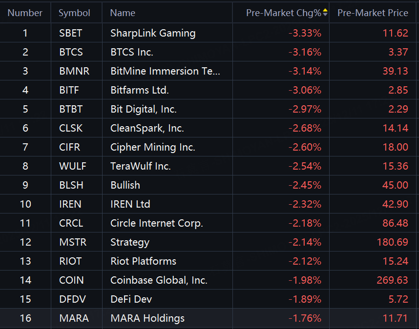 Crypto shares fell in premarket trading. SharpLink Gaming, BTCS, BitMine, Bitfarms, Bit Digital down about 3%; CleanSpark, Cipher Mining, TeraWulf down over 2%.