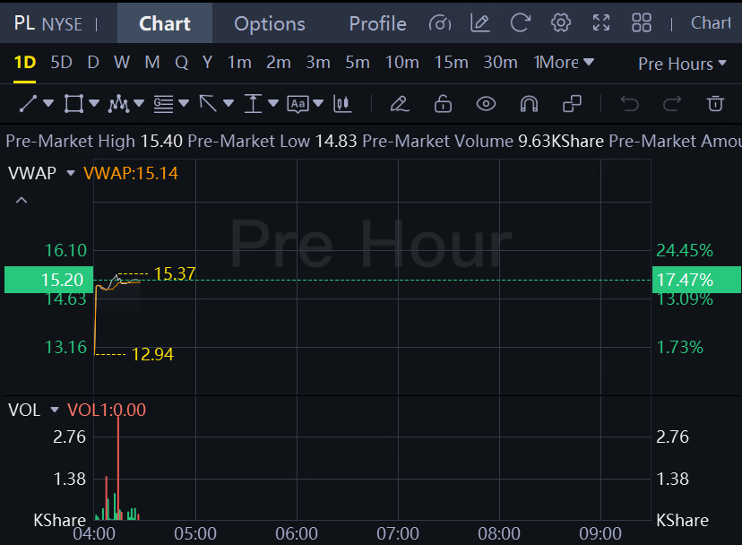 Planet Labs Pbc shares rose 17% in premarket trading. Planet Labs reported breakeven fiscal Q3 non-GAAP results late Wednesday, compared with the loss of $0.03 a year earlier.