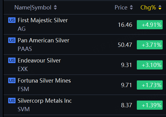 Gold and silver stocks shined on Thursday. First Majestic Silver up 5%; Pan American Silver, Coeur Mining, Endeavour Silver up over 3%.
