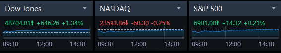 The Dow Jones Industrial Average rose 646.26 points, or 1.34%, to 48,704.01, vaulting above its November 12 closing record. The S&P 500 gained 14.32 points, or 0.21%, to 6,901.00, breaching its October 28 record close. The Nasdaq Composite lost 60.30 points, or 0.25%, to 23,593.86. Alphabet, NVIDIA fell 2%; Robinhood fell 9%; Rocket Lab USA, Inc. up 10%.