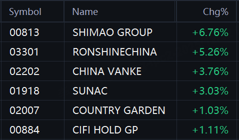 China property stocks jumped in Hong Kong. Shimao Group rose 7%; Ronshine China rose 5%; China Vanke rose 4%; Sunac China rose 3%.