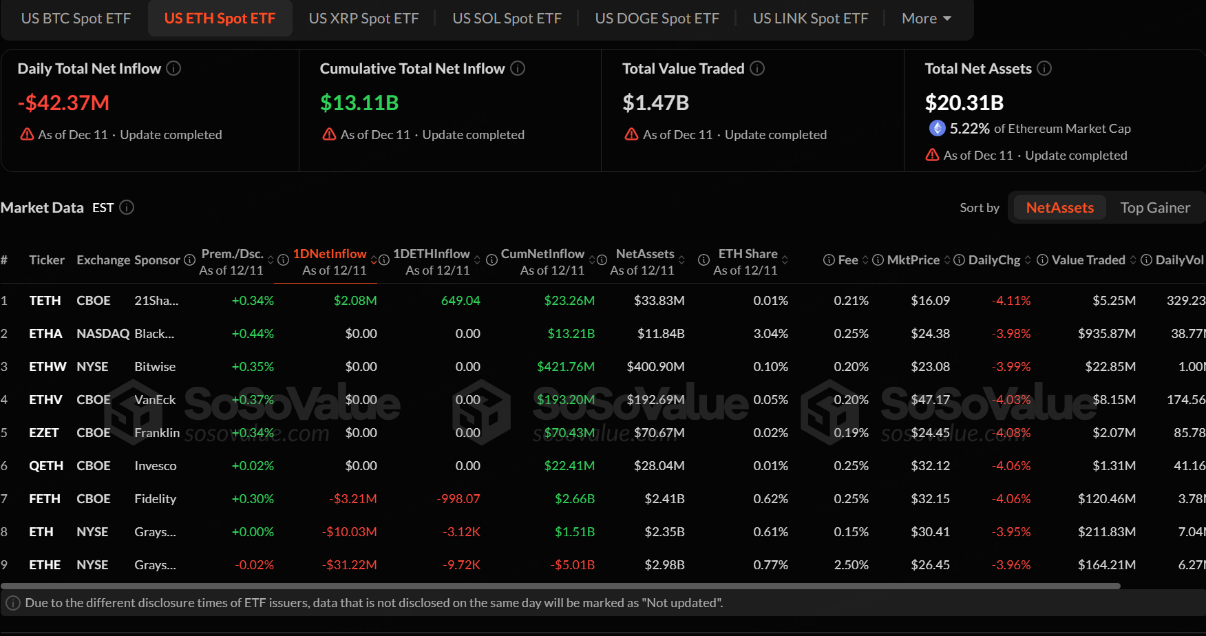The Ethereum spot ETF with the highest net inflow on December 11 was 21Shares Ethereum ETF (TETH), with a net inflow of 2.08 million, according to SoSoValue.