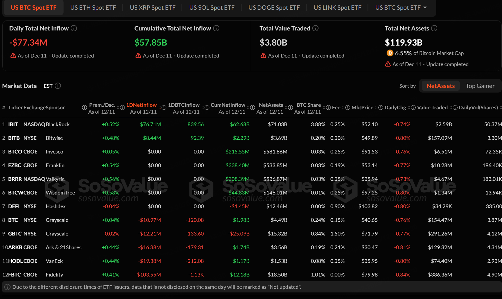 The Bitcoin spot ETF with the highest net inflow on December 11 was iShares Bitcoin Trust (IBIT), with a net inflow of $76.71 million, according to SoSoValue.