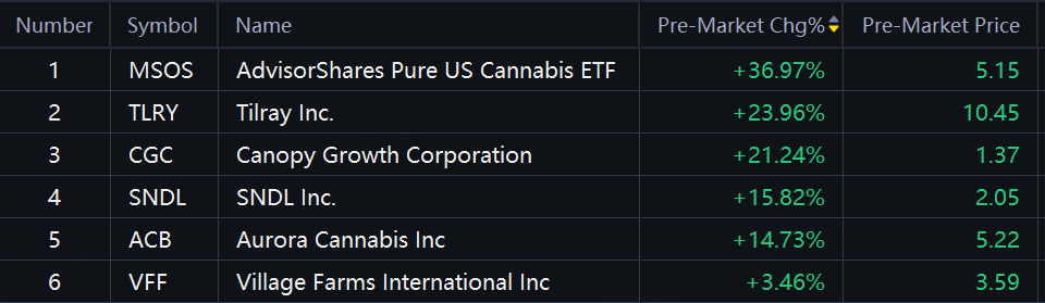 Cannabis stocks surged. Tilray up 24%; Canopy Growth up 21%; SNDL up 16%; Aurora Cannabis up 15%; VFF up 3%.