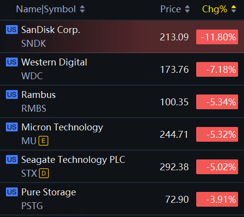 Storage stocks slid on Friday. SanDisk plunged 12%; Western Digital down 7%; Rambus, Micron, Seagate Tech down over 5%.