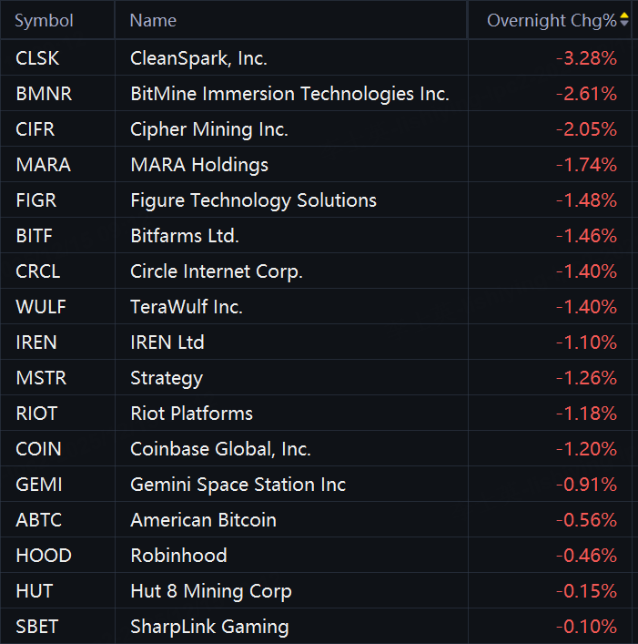Crypto stocks dropped in overnight trading. CleanSpark and BitMine fell 3%; Cipher Mining, MARA Holdings, Figure, and Bitfarms fell 2%; Circle, IREN, Strategy, Riot Platforms, and Coinbase fell 1%.