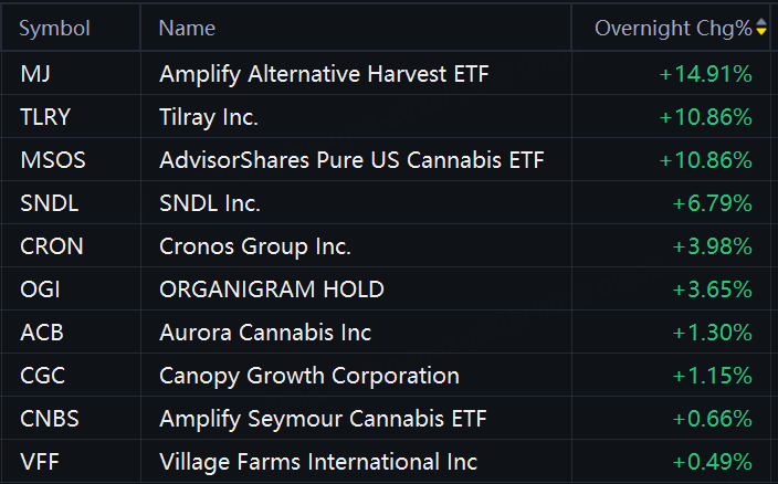 Cannabis ETFs and stocks jumped again in overnight trading. Amplify Alternative Harvest ETF rose 15%; Tilray and AdvisorShares Pure US Cannabis ETF rose 11%; SNDL rose 7%; Cronos and Organigram rose 4%.
