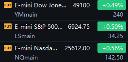 U.S. stock index futures edged higher, with gains led by tech-heavy benchmarks. E-mini Dow futures rose 0.49% to 49100, E-mini S&P 500 futures climbed 0.5% to 6924.75, and E-mini Nasdaq 100 futures advanced 0.56% to 25612. Strength in growth and semiconductor-linked names indicates investors are prioritizing AI and auto-tech catalysts into the open, while broader macro sensitivity remains anchored in rate and dollar moves heading into a busy data week.