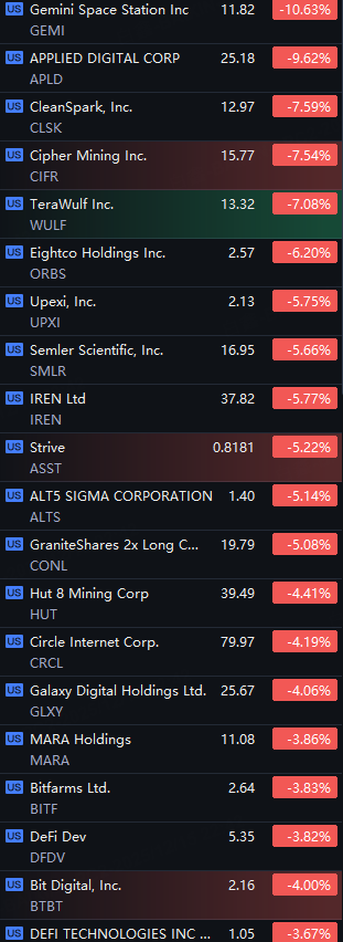 Crypto Stocks Drop. Gemini Space down 11%; Applied Digital down 10%; CleanSpark, TeraWulf and Cipher Mining fell 7%; Circle, MARA and Bit Digital fell 4%.