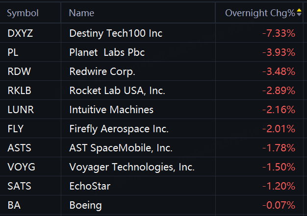 Space stocks dropped again in overnight trading. Destiny Tech100 fell 7%; Planet Labs and Redwire fell 4%; Rocket Lab fell 3%; Intuitive Machines, Firefly Aerospace, AST SpaceMobile, and Voyager Technologies fell 2%.