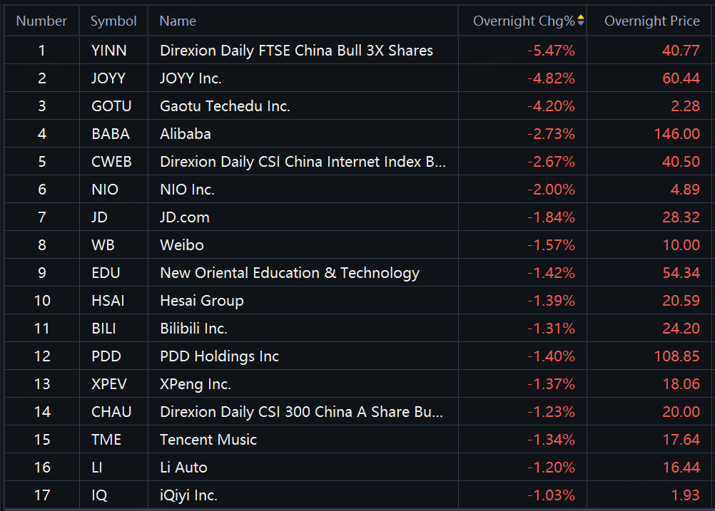 Chinese ADRs and ETFs slid in overnight trading. YINN down over 5%; Alibaba, CWEB, NIO, JD down around 2%; PDD, XPeng, Li Auto down over 1%.
