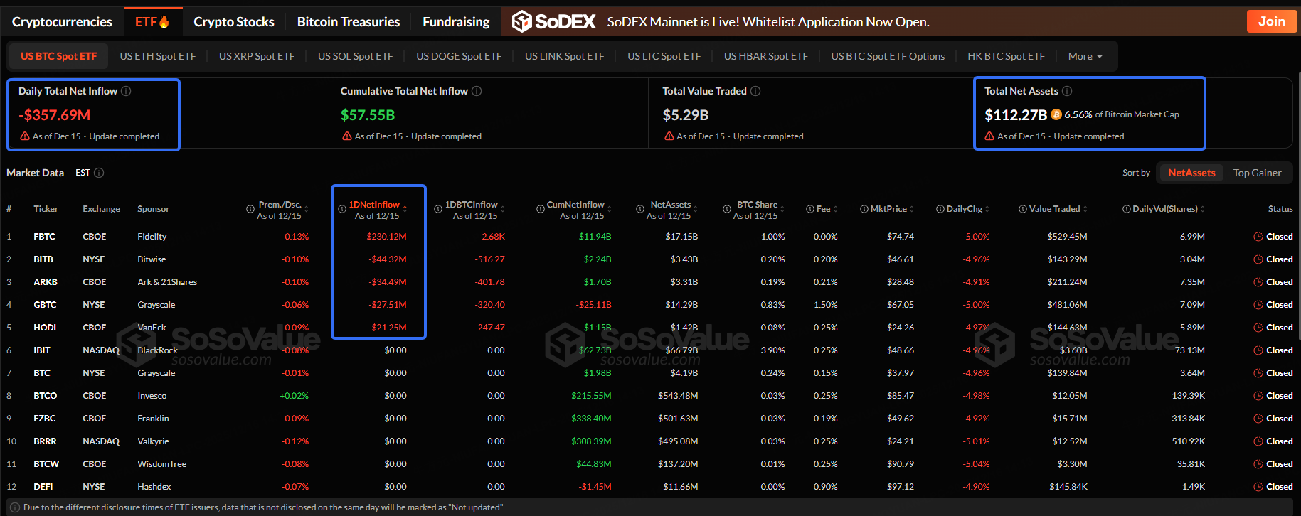 The overall net outflow of the US Bitcoin spot ETF on Monday was $357.69 million. The total net asset value of Bitcoin spot ETFs is $112.27 billion, and the ETF net asset ratio (market value compared to total Bitcoin market value) is 6.56%.