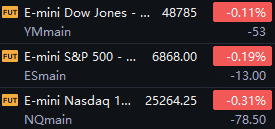 U.S. stock index futures slipped, with Dow futures down 0.11% at 48,785, S&P 500 futures down 0.19% at 6,868, and Nasdaq 100 futures down 0.31% at 25,264.25. A modest pullback across index futures reflects caution ahead of labor-market data, with tech-heavy benchmarks underperforming. Investors are focusing on liquidity conditions, mega-cap earnings sensitivity, and event-driven catalysts in autos, semiconductors, and crypto-linked names as the opening bell approaches.