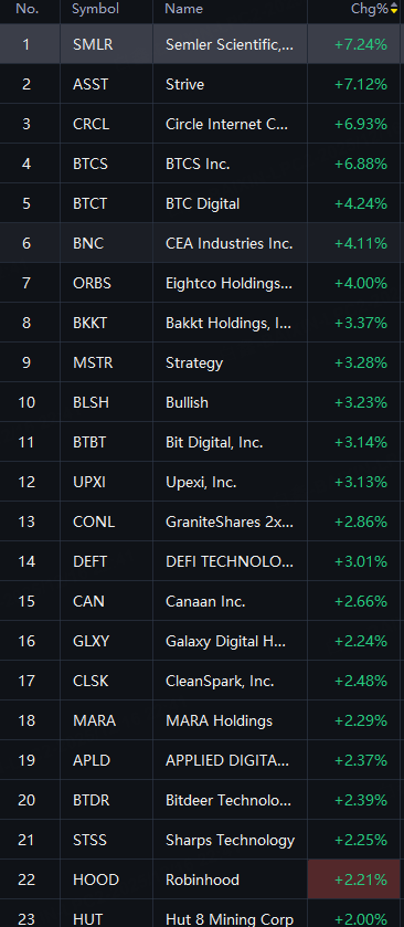 Crypto Shares Rebound As Cathie Wood Bought the Dip. Semler, Strive, BTCS and Circle up 7%; Strategy and Bullish up 3%; MARA and Robinhood up 2%.