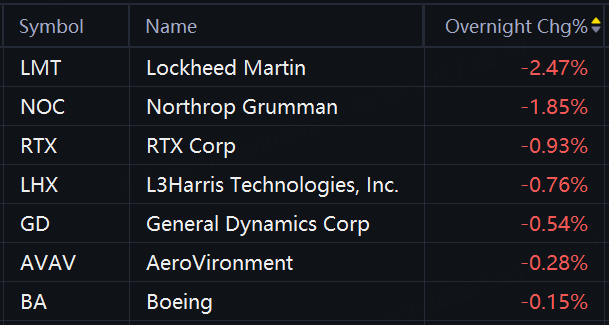 The Trump administration is planning an executive order that would limit dividends, buybacks and executive pay for defense contractors that are over-budget and delayed, according to three sources briefed on the order. Defense stocks dropped in overnight trading. Lockheed Martin fell 3%; Northrop Grumman fell 2%; RTX Corp fell 0.9%.