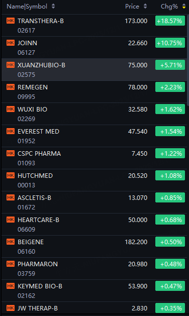 TransThera rose 19%; JOINN rose 11%; Xuanzhu Bio up 6%; Remegen, Wuxi Bio up 2%.
