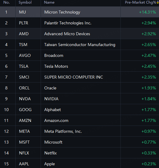 Big Techs Rally. Micron up 14%; Palantir, AMD up 3%; TSMC, Broadcom, Tesla, SMCI and Oracle up 2%.